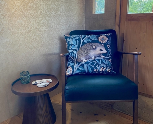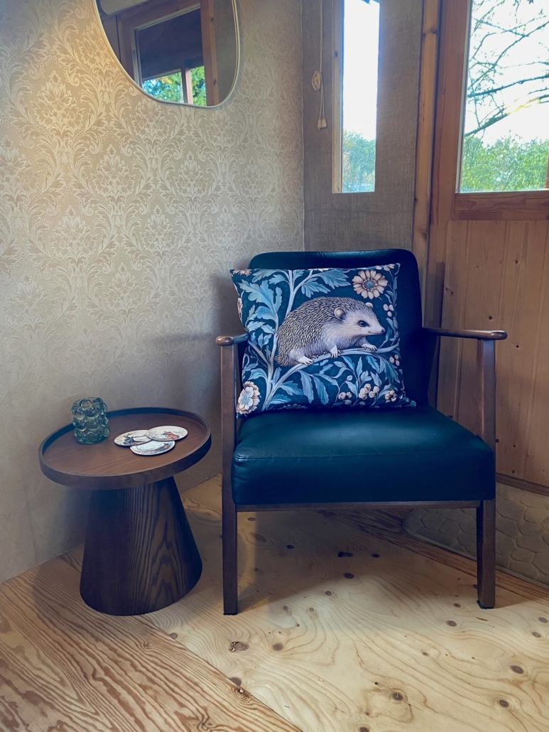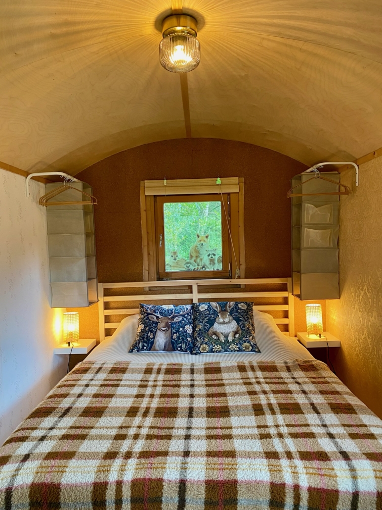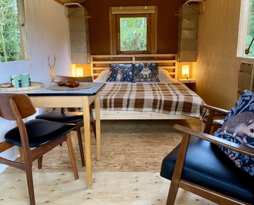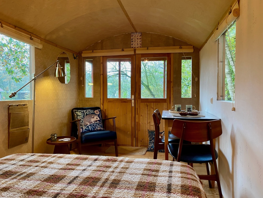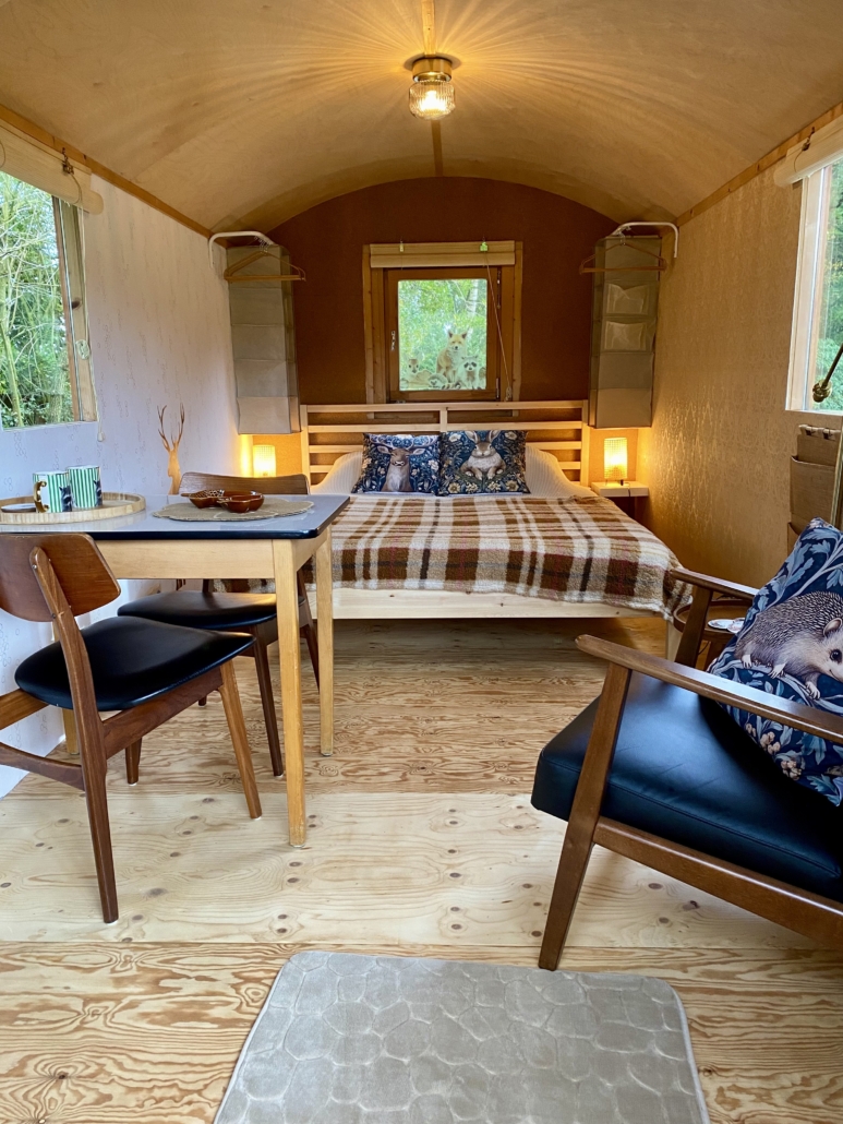 Binnen is het eenvoudig en warm ingericht met natuurlijke materialen en subtiele wild-accenten en een vleugje vintage charme. Er is een comfortabel tweepersoonsbed, een zithoek en een kleine tafel.